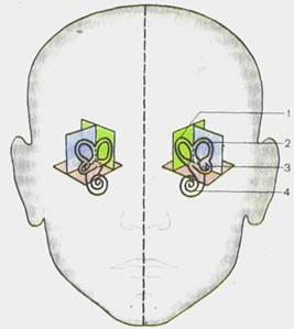 1 — задний полукружный канал; 2—латеральный полукружный канал; 3 — передний полукружный канал; 4 — улитка.