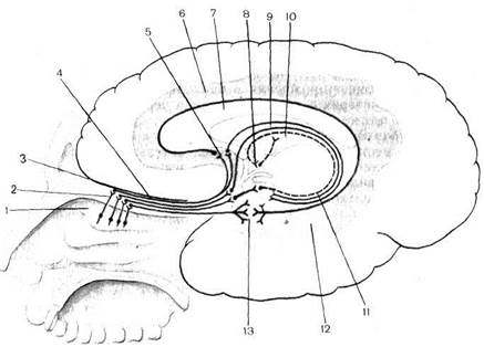 1—concha nasalis superior; 2 — nn. olfactorii; 3—bulbus olfactorius; 4 — tr. olfactorius; 5 — area subcallosa; 6 — gyrus cinguli; 7 — corpus callosum; 8 — corpus mamillare; 9 — fornix; 10 — thalamus; 11 — gyrus dentatus; 12 — gyrus parahippocampalis [hippocampi]; 13 — uncus.