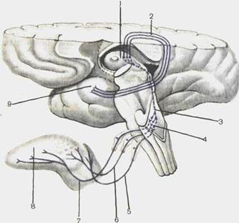 1 — таламус; 2 — волокна, соединяющие таламус и крючок; 3 — волокна, соединяющие ядро одиночного пути и таламус; 4 — ядро одиночного пути; 5 — вкусовые волокна в составе верхнего гортанного нерва; 6 — вкусовые волокна в составе языкоглоточного нерва; 7—вкусовые волокна в составе барабанной струны; 8— язык; 9— крючок.