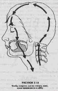 Для простоты и удобства сядьте на стул (рис. 5-13). Эта позиция придает практике легкость, которая благоприятствует расслаблению и хорошей концентрации. Сядьте на край стула, распределив свой вес между ногами и ягодицами. Не переносите весь вес на кости, на которых сидите, потому что со временем это приведет к появлению боли в седалищном нерве. Влагалище и промежность не должны быть стеснены одеждой, но должны быть прикрыты удобным нижним бельем или другой свободной одеждой, чтобы защитить их от воздействия сквозняков. В качестве полезной техники, используемой с древнейших времен, можно делать следующее: женщина может расположить твердый круглый предмет - вроде мяча - таким образом, чтобы во время практики он надавливал непосредственно на ее влагалище и клитор; она может также сесть на каблук одного ботинка, крепко прижимая его с целью более легкой активации энергии ци к своему клитору. Если вы практикуете циркуляцию энергии по Микрокосмической орбите или цигун "железная рубашка", то вы, скорее всего, уже хорошо натренированы в перемещении энергии вверх и можете опустить этот этап. Прижмите язык к нёбу; это имеет существенное значение для циркулирования ци и для объединения переднего и заднего каналов Микрокосмической орбиты в единый канал (рис. 5-14). Ноги прочно опираются в пол, руки покоятся на коленях ладонями вниз. Спина должна быть совершенно прямой в пояснице, но слегка изогнутой в области плеч и шеи. Это незначительное искривление вперед верхней части спины способствует расслаблению грудной клетки и течению энергии через шею, грудную клетку и брюшную полость. Подбородок должен быть слегка втянутым. Поза военного, в которой плечи развернуты назад, а голова высоко поднята, способствует размещению энергии в верхней части тела и предотвращает ее возвращение в нижние центры.