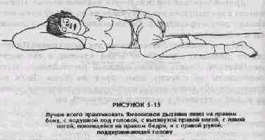 В положении лежа лежать нужно на правом боку. Подложенная под голову подушечка должна поднимать ее на три-четыре дюйма, так чтобы ось головы была перпендикулярна плечам. Четыре пальца правой руки помещаются непосредственно спереди от правого уха, а большой палец помещается позади уха и слегка отгибает его вперед, чтобы оно оставалось открытым. Ухо должно оставаться открытым, чтобы позволить воздуху проходить через евстахиеву трубу и уравновешивать давление в правом и левом ушах. Это очень важно, поскольку во время этой практики вы можете создать избыточное давление ци. Левая рука покоится на внешней части левого бедра. Правая нога выпрямлена; левая нога покоится на правой и слегка согнута (рис.5-15). В подобной позе часто спят львы. Животными руководит мудрый инстинкт, поскольку в этой позе позвоночный столб освобождается от воздействия гравитации и может принять естественную кривизну. Лежание на правом боку может освободить позвоночник от напряжения.