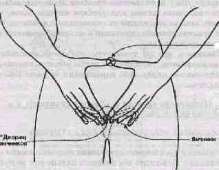 Начните упражнение с определения местоположения "дворца яичников". Поместите оба больших пальца рук на пупок, а при помощи указательных пальцев образуйте треугольник. Место, где соединяются указательные пальцы, и представляет собой "дворец яичников". Слегка отставьте в стороны мизинцы; под ними расположены яичники (рис. 5-16). Пока мизинцы расположены над ними, осознайте их расположение. Трите яичники до тех пор, пока не почувствуете, что они разогреваются. Сконцентрируйтесь с целью произвести больше энергии в яичниках и в яйцеклетках. Одновременно мысленно пытайтесь управлять лонно-копчиковой мышцей, стараясь сжимать и приоткрывать влагалище так деликатно, как это получается у лепестков цветка. Энергия может начать проявлять себя в виде ощущений теплоты, напряженности, набухания, покалывания и тому подобного. Каждый человек может реагировать на эту энергию по-своему. Когда вы начинаете что-то чувствовать, вдохните и приведите энергию ко "дворцу яичников" (на который указывают ваши указательные пальцы). Нежное открывание и закрывание влагалища совместно с мысленной концентрацией на этом постепенно дадут вам возможность собрать энергию яичников около "дворца яичников" и поглотить ее.