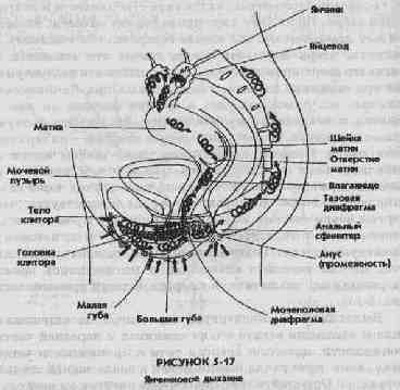 дыхании, мы будем говорить о сжатии мышцы ци как о "сжатии и втягивании промежности". Вы можете прочувствовать маршрут, по которому следует энергия, - из верхней части матки в матку, потом через канал шейки матки и влагалище вниз к промежности. Прежде чем прибыть к промежности энергия может направиться в обход через тело и головку клитора. В любом случае вы почувствуете, что энергия переместилась из дворца яичников в промежность, независимо от того, ощущаете ли вы маршрут, по которому она следует, или нет. Задержите дыхание, сделайте короткий вдох, плотно закройте влагалище и на некоторое время задержите энергию яичников в передней части промежности (рис. 5-17).