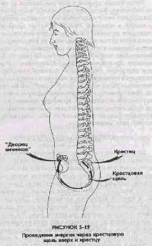 Щелевое отверстие крестца представляет собой вырез в кости крестца, расположенный несколько вверх от кончика позвоночника, и если оно открыто, то через него вы сможете втягивать теплую энергию ваших яичников в позвоночник (рис. 5-19). Обычно это бывает трудно, поскольку энергия яичников является более плотной, чем ци, а она должна прокачиваться через узкое отверстие. Когда эта энергия входит в щель, некоторые люди испытывают боль или покалывание "булавками и иголками". Если это происходит с вами, не беспокойтесь. Если вы столкнулись с этими проблемами вы можете помочь прохождению энергии через щель, время от времени нежно массируя эту область через шелковую ткань.