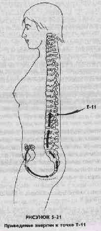 Когда вы почувствуете, что собрано достаточное количество энергии яичников, вдохните коротким вдохом и закройте влагалище, оттянув его вниз и, тем самым, оттянув энергию вниз к промежности, а затем напрягите и втяните вверх переднюю часть промежности для приведения энергии в эту область. Отдохните немного и осознайте энергию, которая течет из яичников вниз к влагалищу, клитору и промежности. Сделайте короткий вдох и втяните по направлению к копчику среднюю и заднюю части промежности - это необходимо для приведения энергии к крестцу. Слегка отогните крестец наружу, как если бы вы прижимали его к стене. Сделайте небольшую паузу и почувствуйте, как активизировалась крестцовая "помпа". Снова сделайте короткий вдох без выдоха и выгните спину наружу к воображаемой стене, чтобы выпрямить участок с точкой Т-11. Это заставит "помпу" проталкивать энергию яичников вверх к точке Т-11 (рис. 5-21). Удерживайте энергию в этой точке, пока не почувствуете, что область уже наполнена энергией и та течет вверх сама собой. Когда вы почувствуете неудобство, выдохните и отрегулируйте свое дыхание.