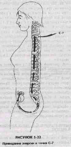 Если вы почувствовали, что собрано достаточное количество энергии яичников, то вдохните небольшую порцию воздуха и закройте влагалище, втягивая энергию яичников вниз к промежности, а затем втяните вверх переднюю часть промежности для приведения энергии в эту точку. Отдохните немного и осознайте энергию, которая пришла из яичников во влагалище, клитор и промежность. Сделайте короткий вдох, сожмите среднюю и заднюю части промежности, а затем тяните энергию вверх к крестцу и точкам Т-11 и С-7. Когда вы достигнете точки С-7, продвиньтесь слегка от грудины к спине и почувствуйте усилие в точке С-7 и в обоих плечах и то, как они активизируются, вытягивая энергию вверх (рис. 5-22). Эти действия активизируют тимус на увеличение силы, вытягивающей энергию вверх. Удерживайте энергию в этой точке максимально удобным для вас образом. По мере того, как вы будете больше практиковать, вы обнаружите, что постепенно вы учитесь все больше задерживать свое дыхание и лучше поглощать воздух.