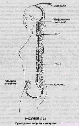(рис. 5-24). По мере того, как вы продолжаете вдыхать, ведите энергию вниз к промежности, а затем вверх к крестцу, точкам Т-11 и С-7 и "нефритовой подушке". Далее устремите глаза и другие органы чувств вверх, чтобы помочь провести энергию к точке байхуэй на макушке головы и в шишковидное тело.