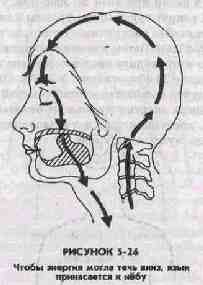 Обеспечьте, чтобы язык прикасался к нёбу (к поверхности позади передних зубов), так чтобы теплая энергия яичников могла течь вниз к третьему глазу, к внутренним пазухам носа и через язык вниз к горлу и к сердечному центру (рис.5-26). Некоторое время удерживайте энергию в сердечном центре, наполняя его до тех пор, пока оно ощущается открытым; наслаждайтесь ощущением любви, радости и покоя; затем ведите энергию дальше к солнечному сплетению и пупку. Собирайте сексуальную энергию в пупке, где она может безопасно храниться.