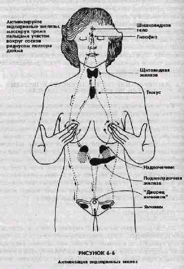 Когда некоторые железы стимулируются к выделению своих гормонов (рис. 6-6), активизируются органы, с которыми они связаны, и, в конечном счете, оказывается воздействие на каждую клетку тела. Стимулирование грудей в особой степени воздействует на шишковидное тело, гипофиз и тимус.