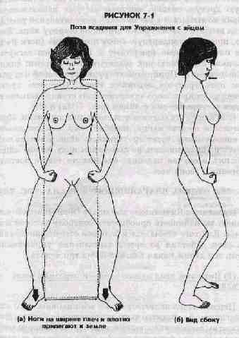 Для того чтобы облегчить введение яйца, необходимо использовать желе-смазку, любое спермацевтическое желе или крем, не содержащее в себе компонентов нефти, любое натуральное масло вроде нерафинированного растительного масла, о котором вы знаете, что оно достаточно безопасно, или любую другую смазку, которую вы уже использовали и которая не вызывает в вас никакой нежелательной реакции. Всегда вводите сначала более широкую сторону яйца. Введя яйцо, примите стандартную "позу наездника" (ноги на ширине плеч и плотно прилегают к земле; ноги согнуты в лодыжках и коленях; пах "охватывается" ногами; спина и шея выровнены). Приподнимите руки перед собой под углом сорок пять градусов ладонями вверх. Стисните кулаки. Именно из этой основной "укорененной" стойки выполняется каждое из упражнений с яйцом (рис. 7-1(а) и (б)).