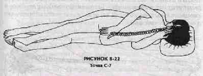 Шестой энергетической точкой является точка С-7, наибольший выступ позвоночного столба, расположенный в точке соединения плеч и основания шеи. Эта точка управляет всеми сухожилиями тела. Даосы считают эту точку точкой великого соединения потоков ци рук, головы и спины. Открытие этой точки и связь с ней являются весьма важными для практик гунфу целительной руки, цигуна "железная рубашка" и тайцзи-цигуна. (Описание этих практик можно найти в конце данной книги в приложении "Целительная система Дао: курсы, предлагаемые в различных центрах".) Поместите свою левую руку на точку С-7, а правую - на крестец (рис.8-22). Сожмите анус и приведите сексуальную энергию к этой точке.