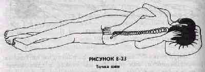 Седьмая энергетическая точка расположена в середине задней части шеи, между третьим и четвертым шейными позвонками. Левой ладонью накройте эту точку, правой ладонью накройте крестец и одновременно незначительно сжимайте переднюю, среднюю и заднюю части ануса (рис.8-23). (В данном случае нет необходимости сжимать левую и правую части ануса.) Приведите энергию к шее и почувствуйте, как она наполняется энергией. Шея является самой загруженной "транспортной развязкой" тела. Все сигналы, которые управляют телом и нашими эмоциями, возникают в мозге и проходят через это "бутылочное горлышко". При наличии сильных стрессов и эмоциональных воздействий в шее начинает расти напряжение и возникают "заторы".