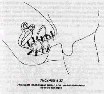 Вы должны позаботиться о том, чтобы ваш партнер не достиг точки, от которой нет возврата. Когда он близок к эякуляции, вытащите его пенис до уровня G-пятна, где можно обмениваться энергией. Отдохните в этом состоянии. Если вам удается помочь своему партнеру избежать эякуляции, то вы можете стиснуть влагалищем не головку, а основание пениса, что будет блокировать стремление к эякуляции (рис. 8-36). Здесь имеется опасность, заключающаяся в плохой согласованности действий; поэтому, если вы плохо овладели техникой стискивания пениса, ваш партнер может потерять семя. Это означает, что вы должны использовать это стискивание до того, как возникнет страстное побуждение к эякуляции, а не непосредственно в момент эякуляции. Успех этой техники зависит от уверенности действий при этом стискивании. Для тренировки этого схватывания важными являются Оргазмическое вытягивание, Упражнения с яйцом и Влагалищная тяжелая атлетика. Задержка эякуляции также поможет вашему партнеру сохранить эрекцию полового члена, давая вам возможность быстрее перейти к следующему обмену (рис.8-37). Дополнительную информацию относительно задержки эякуляции вы сможете найти в главе "Секреты сохранения семени" в книге "Даосские секреты: совершенствование мужской сексуальной энергии".