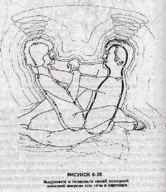 Расслабьтесь и обменяйтесь энергией. В этот момент для вашего партнера было бы хорошо практиковать сначала сильные сжатия Большого вытягивания, пока он не будет в состоянии перемещать свою сексуальную энергию ям вверх и управлять ею. Если он овладел этим, вам не нужно охватывать головку его полового члена, чтобы помочь ему в контроле за эякуляцией. Почувствуйте, как его горячая мужская "янская" энергия начинает проходить в вас. Эта горячая энергия не похожа на вашу энергию. Если вы почувствовали ее, то наступает ваша очередь вдохнуть и практиковать Оргазмическое вытягивание, при котором ваша сексуальная энергия инь совместно с его сексуальной энергией ян вытягиваются по направлению к высшему центру. Позвольте сначала энергии течь в вашу Микрокосмическую орбиту. Затем выдохните и позвольте холодной женской энергии инь течь в вашего партнера (рис. 8-38). В этот момент ваш партнер может использовать нежность Тестикулярного дыхания (как это описано позже в данной главе) для поглощения холодной энергии инь в свою систему.