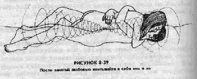 Когда вы прекращаете активные занятия любовью, начинайте объятия в любой приятной для вас позиции. Если мужчина является тяжелым, женщина обычно располагается сверху. Если женщина является более сильной, чем мужчина, она обычно располагается снизу, чтобы ом мог более легко вытягивать энергию. Если женщина слабая, то сверху располагается она - тогда ей легче вытягивать энергию. В любом случае будьте уверены, что это та позиция, в которой вы можете оставаться длительное время. Для этого у вас должно быть две дополнительные подушки.