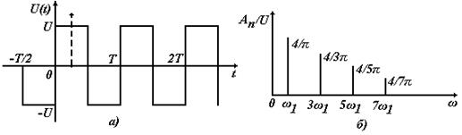 Рис. 6.2. Сигнал вида меандр (а) и его амплитудный спектр (б)
