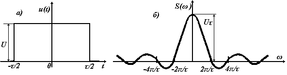 Рис. 6.3. Прямоугольный импульс (а) и его спектральная плотность (б)