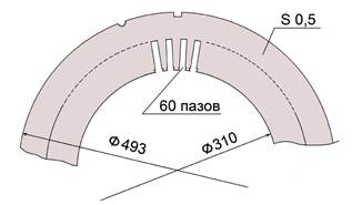 Обмотка статора двухслойная петлевая, выполнена из 60-ти ромбовидных жестких секций (рис.10). Каждая секция состоит из восьми витков прямоугольного медного эмалированного провода сечением 1,8 х 6,3 мм. Витки изолированы лентой, пропитанной лаком.