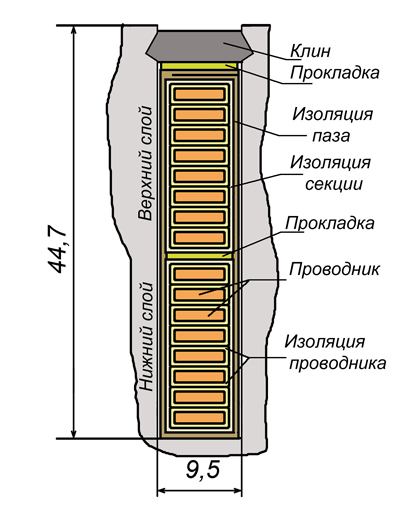 Активные части обмотки закреплены в пазах стекло-текстолитовыми изоляцион-ными клиньями. Расположение секций в пазу представлено на рис.11.