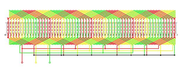 Обмотка статора состоит из трех фазных обмоток, которые образованы из четырех катушечных групп (по пять секций в каждой), включенных параллельно.