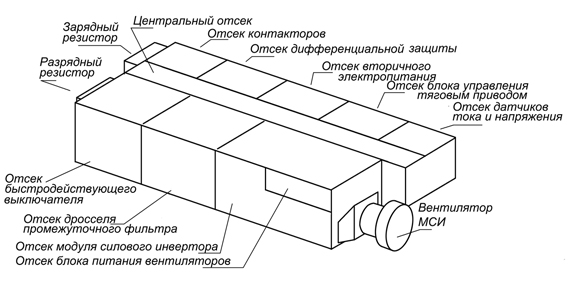 Контейнер представляет собой металлическую сварную конструкцию, разделенную на отсеки со смонтированным оборудованием. Управление оборудованием тягового инвертора производится посредством блока управления тяговым приводом.