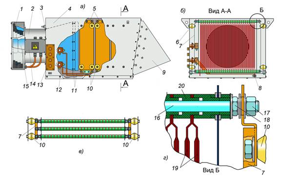 Через изоляционные трубки и керамические вставки 20 между стержнями расположены отрезки резистивной ленты 19, соединенные сваркой в единую последовательную цепь. Конструкция элемента тормозного резистора представлена на рис. 17 г.