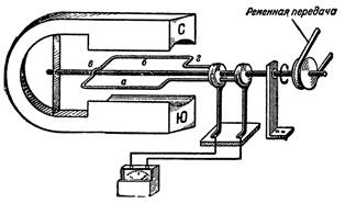 Прямоугольная рамка, изготовленная из медной проволоки, укреплена на оси и при помощи ременной передачи вращается в поле магнита. Концы рамки припаяны к медным контактным кольцам, которые, вращаясь вместе с рамкой, скользят по контактным пластинам (щеткам).
