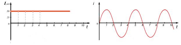 | Рис. 20. Графическое изображение постоянного и переменного тока |
