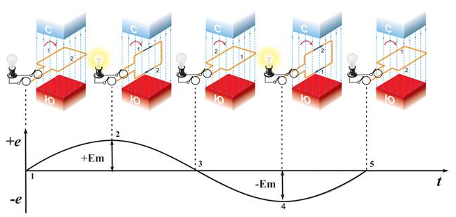 На этом заканчивается один цикл изменения ЭДС, но если продолжать вращение рамки, тотчас же начинается второй цикл, в точности повторяющий первый, за которым, в свою очередь, последует третий, а потом четвертый, и так до тех пор, пока мы не остановим вращение рамки.