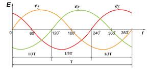В каждой обмотке (катушке) индуцируется переменная ЭДС одной и той же частоты, но моменты прохождения этих ЭДС через нуль (или через максимум) в каждой из катушек окажутся сдвинутыми на 1/3 оборота друг относительно друга, т.к. индуктор проходит мимо каждой катушки на 1/3 периода позже, чем мимо