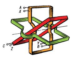 Три одинаковые неподвижные катушки (рис.29), оси которых лежат в одной плоскости под углом 120° друг к другу, соединены звездой или треугольником.