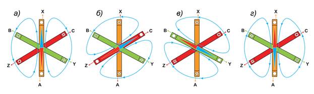 Например, в начальный момент времени t1 (рис. 30) ток в катушке АХ отсутствует, в катушке BY имеет отрицательное, а в катушке CZ — положительное направление, и поэтому на рис. 31 а в начале катушки В ток направлен на наблюдателя, а в начале катушки С — от наблюдателя. Каждый из токов iA, iB, iC создает магнитное поле. Магнитные поля, созданные отдельными токами, складываются, образуя результирующее магнитное поле. На рис. 31 силовыми линиями показано результирующее магнитное поле. Из рисунка видно, что результирующее поле в начальный момент времени направлено снизу вверх (показано в виде стрелки магнитного компаса).