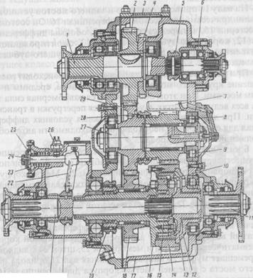1-ведущий вал; 2-ведущее зубчатое колесо; 3-крышка люка для установки коробки отбора мощности; 4-колесо отбора мощности; 5-муфта включения лебедки; 6-коробка отбора мощности; 7-маслосборник; 8-шестерня понижающей передачи; 9-роликовый подшипник; 10-саттелиты; 11-вал привода среднего и заднего мостов; 12-обойма дифференциала; 13-ко-ронное колесо дифференциала; 14-ведущее колесо дифференциала; 15-шестерня дифференциала; 16-межосевой дифференциал; 17-картер раздаточной коробки; 18-шестерня повышающей передачи; 19-муфта; 20-муф-та блокировки дифференциала; 21-вал привода переднего моста; 22-вил-ка; 23-пневматическая камера; 24-шток; 25-мембрана; 26-электропневмок-лапан; 27-промежуточный вал; 28-муфта; 29-промежуточная шестерня