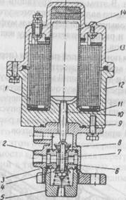 1-электромагнит; 2-корпус клапана управления раздаточной коробкой; 3-седло клапана; 4-впускной клапан; 5-пробка клапана; 6-распорная втулка; 7-стержень клапана; 8-выпускной клапан; 9-уплотительное кольцо; 10-шток; 11-дисковая пружина; 12-корпус; 13-крышка; 14-сердечник