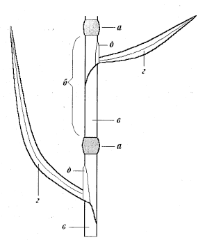 Рис. 1. Схема строения побега у злаков: а – узел стебля; б – междоузлие стебля; в – листовое влагалище; г – листовая пластинка; д – язычок | Рис. 2. Тип влагалища листа: а – открытое (со свободными краями); б – замкнутое (со сросшимися краями) |