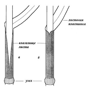 Рис. 2. Тип влагалища листа: а – открытое (со свободными краями); б – замкнутое (со сросшимися краями)