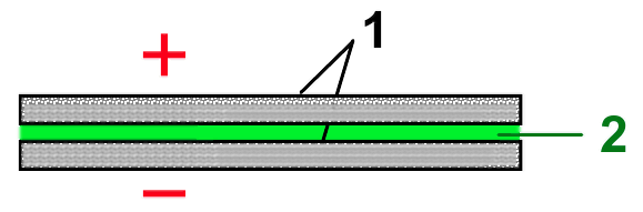 Рис. 3. Принцип устройства ультраконденсатора. 1 электроды