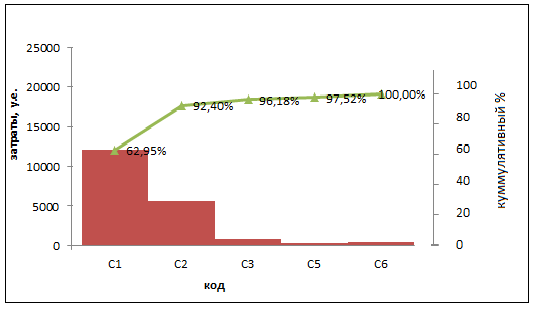 Вывод: диаграмма Парето показывает, что необходимо начинать улучшение качества с устранения затрат на отходы производства, переделки и ремонт, т.к. на них приходится наибольшее количество затрат. Необходимо выяснить, на каких этапах они образуются.