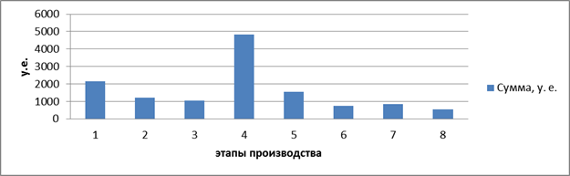| Этапы производства | Сумма, у. е. | Доля, % |