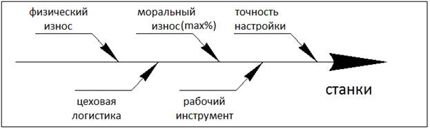 Вывод: схема Исикавы внутренних потерь показала, что максимальные потери связаны с отходами производства. Для устранения причин этого, рассматривается схема относительно отходов. Схема Исикавы отходов производства показывает, что основная причина проблемы кроется на этапе механообработки. В свою очередь, проанализировав еще две схемы Исикавы, приходим к выводу, что на этот этап производства основное влияние оказывает парк станков цеха, а на него сильный моральный износ оборудования.