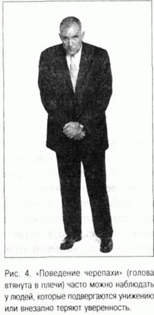 Иногда лимбический мозг использует еще одну разновидность защитной реакции замирания и заставляет нас сжиматься, чтобы выглядеть маленькими и неприметными. Во время наблюдения за магазинными ворами мне часто приходилось замечать, как они стараются скрыть свое физическое присутствие, ограничивая амплитуду своих движений или сутулясь, словно пытаясь стать невидимыми. Как ни парадоксально, но такое поведение лишь еще сильнее выделяет их из толпы, потому что отличается от нормального. Большинство людей ходят по магазинам, довольно энергично размахивая руками, и спину держат прямо. С точки зрения психологии поведение магазинных воров или ваших детей, когда они пробуют незаметно взять печенье из буфета, можно объяснить стремлением слиться с окружающей обстановкой или, говоря другими словами, «спрятаться» на открытом месте. С той же целью, спрятаться на открытом месте, люди стараются сделать менее заметной свою голову. Для этого они поднимают плечи к ушам и опускают голову, достигая «эффекта черепахи». Представьте, как покидают поле игроки проигравшей футбольной команды, и вы сразу поймете, что я имею в виду (см. рис. 4).