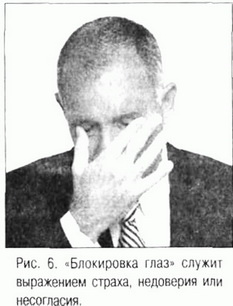 Подобно тому, как юноша может отвернуться от опоздавшей на свидание девушки, так и человек во время переговоров может отодвинуться от своего визави, если услышит непривлекательное предложение или почувствует, что сделка может плохо для него окончиться. Эти действия могут сопровождаться блокирующими элементами поведения. Например, бизнесмен может закрывать или тереть глаза, заслонять лицо руками (см. рис. 6). Он может отклониться от стола, отодвинуться от оппонента или развернуть стопы в направлении ближайшего выхода. Подобные элементы поведения не являются признаками обмана, а скорее указывают на то, что человек чувствует себя некомфортно. Все эти формы древней как мир реакции бегства называются дистанцирующими сигналами невербального поведения и означают, что бизнесмен недоволен тем, что происходит за столом переговоров.