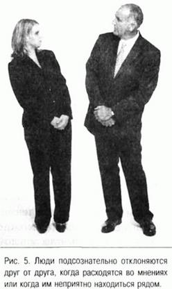 Чтобы увеличить дистанцию до человека, который сидит рядом, можно отклонить назад туловище, поставить на колени какой-нибудь предмет (сумочку) или развернуть стопы к ближайшему выходу. Все эти элементы поведения контролируются лимбическим мозгом и означают, что кто-то желает дистанцироваться от неприятной ему личности, группы людей или от любой потенциальной угрозы. Опять же, наша способность понимать такое поведение объясняется тем, что в течение миллионов лет люди старались держаться как можно дальше от всего, что нам не нравилось или могло причинить вред. Вот почему мы испытываем желание поскорее Уйти с траурной церемонии, стараемся держаться подальше от людей с дурной славой, отклоняемся от встречи с теми, кого не желаем видеть или с кем мы категорически не согласны (см. рис. 5).