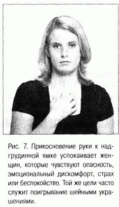 Женщины, которым нужно успокоиться, поступают иначе. Например, они могут прикасаться к шейным украшениям, если те на них надеты, поправлять их или совершать с ними какие-ни-°Удь другие манипуляции. Как уже упоминалось, Другим характерным способом использования жен-