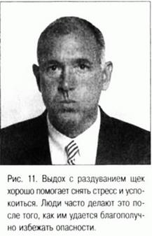 Успокаивающее поведение проявляется в разных формах. Когда мы испытываем стресс, то нам помогает успокоиться легкий массаж шеи, поглаживание лица или игра с прядями волос. Все эти действия совершаются автоматически. Мозг отправляет сообщение: «Пожалуйста, успокойте меня», и наши руки немедленно отвечают на его просьбу, помогая нам снова почувствовать себя комфортно. Иногда мы успокаиваем себя, поглаживая щеки или губы изнутри языком, или надуваем щеки и медленно выдыхаем воздух (см. рис. 10 и 11). Когда стресс испытывает курильщик, он почти не выпускает изо рта сигарету, а если стрессу подвергается человек, жующий резинку, то он начинает быстрее двигать челюстями. По мнению профессора Панксеппа, все эти успокаивающие действия удовлетворяют одну и ту же потребность мозга. То есть мозг заставляет тело каким-то образом стимулировать нервные окончания, чтобы секретировать успокаивающие эндорфины, которые помогают ему успокоиться.