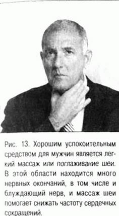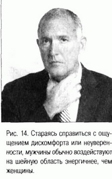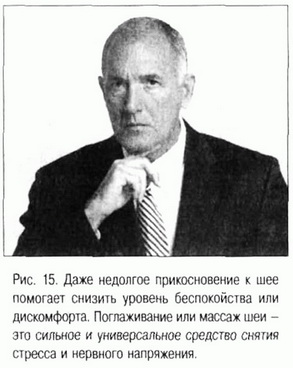 За несколько десятков лет, посвященных изучению невербального поведения, я убедился в существовании заметных различий в приемах использования шеи как успокоительного средства у мужчин и женщин. Обычно мужчины действуют более энергично, сжимая или обхватывая ладонями шею под подбородком. Таким образом они стимулируют нервы шеи (особенно блуждающий нерв или каротидный синус), что снижает частоту сердечных сокращений и производит успокаивающий эффект. Иногда мужчины поглаживают боковые или заднюю сторону шеи пальцами или с той же целью поправляют узел галстука или воротник рубашки (см. рис. 15).
