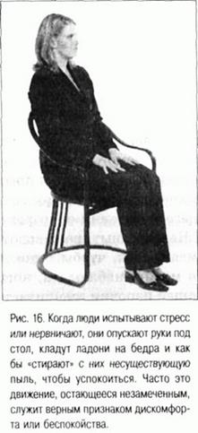 «Очистка ног» — это одна из форм успокаивающего поведения, которая часто остается незамеченной, потому что это действие производится под столом. В ходе этого успокаивающего занятия человек кладет руку (или обе руки) на ногу (или на обе ноги), а затем скользит ладонями по верхней поверхности бедер в направлении коленей (см. рис. 16). Некоторые люди выполняют это движение только один pan, но часто оно производится регулярно или просто превращается в массаж ног. Кроме того, таким движением можно вытирать вспотевшие ладони, и в этом случае оно выдает беспокойство, но в основном его используют, чтобы избавиться от напряжения. Этот невербальный сигнал не должен ускользать от вашего внимания, потому что однозначно свидетельствует о том, что человек испытывает стресс.