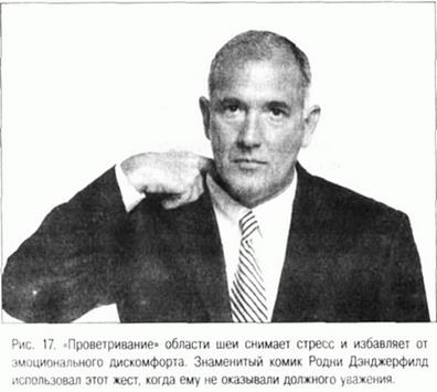 Эта форма поведения выражается в том, что человек (как правило, мужчина) закладывает пальцы между воротником рубашки и шеей, чтобы оттянуть ткань от кожи (см. рис. 17). Такое «проветривание» часто становится реакцией на стресс и служит достоверным признаком того, что человек сильно расстроен тем, о чем он думает, или из-за того, что наблюдает вокруг себя. Женщина может подавать такой же невербальный сигнал не столь заметно, просто оттягивая вырез блузки или встряхивая спадающими на плечи волосами, чтобы охладить шею.