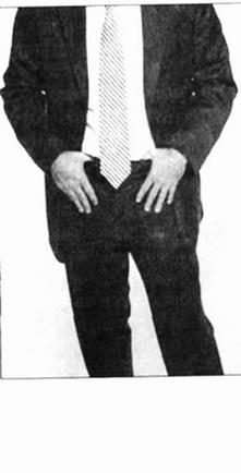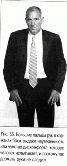 Попробуйте сами провести небольшой эксперимент. Засуньте большие пальцы в карманы брюк и спросите окружающих, как вы выглядите. Их ответы подтвердят, что в этой позе вы производите далеко не лучшее впечатление. Вы никогда не увидите, чтобы кандидат в президенты или руководитель какой-нибудь страны прятал большие пальцы рук в карманах. Уверенные люди так себя не ведут (см. рис. 55).