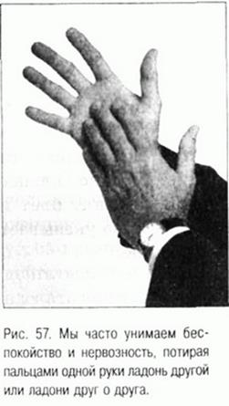 Человек, испытывающий сомнение (отсутствие твердой уверенности) или не очень сильный стресс, лишь слегка потирает ладони друг о друга (см. рис. 57). Но если напряженность ситуации возрастает или уровень его уверенности продолжает падать, то нежное поглаживание пальцами ладони внезапно сменяется выразительным растиранием переплетенных пальцев (см. рис. 58). Переплетение пальцев рук — это явный признак сильного дистресса, который мне приходилось наблюдать в самые напряженные моменты дачи показаний — как в ФБР, так и перед конгрессом США. Как только поднимается исключительно щекотливая тема, пальцы Допрашиваемого распрямляются и переплетаются, а Кисти начинают интенсивно двигаться вперед-назад. Лично я склонен объяснять это тем, что усиление тактильного контакта кистей рук помогает человеку Увеличить количество посылаемых в мозг успокаи-вающих сигналов.